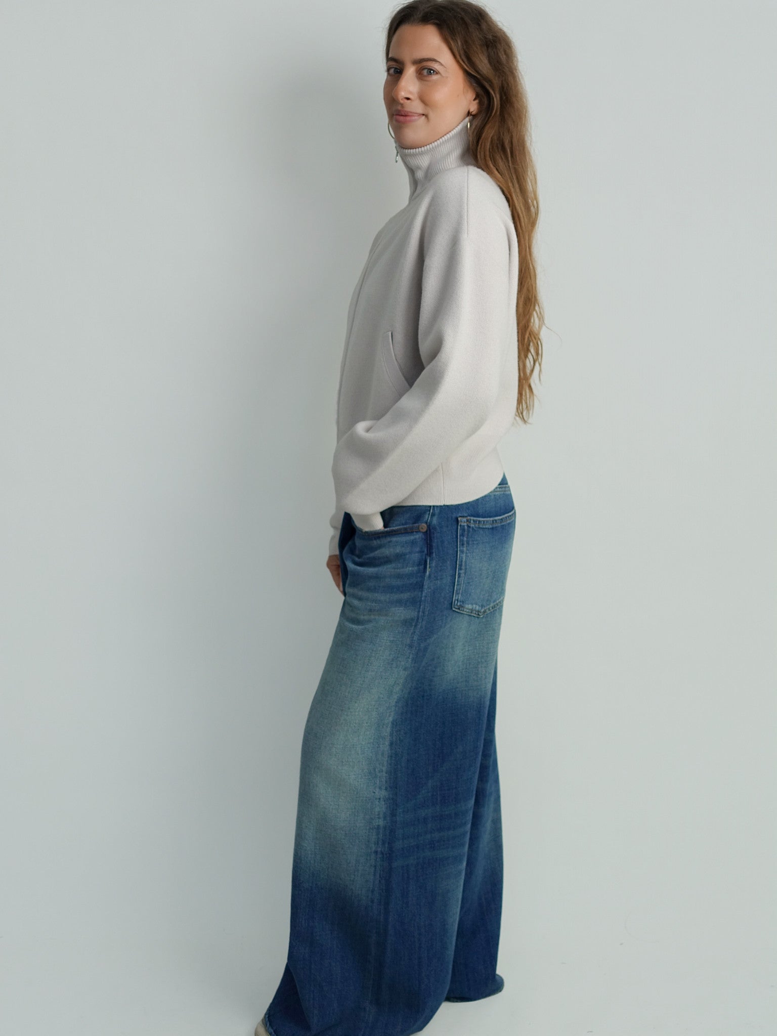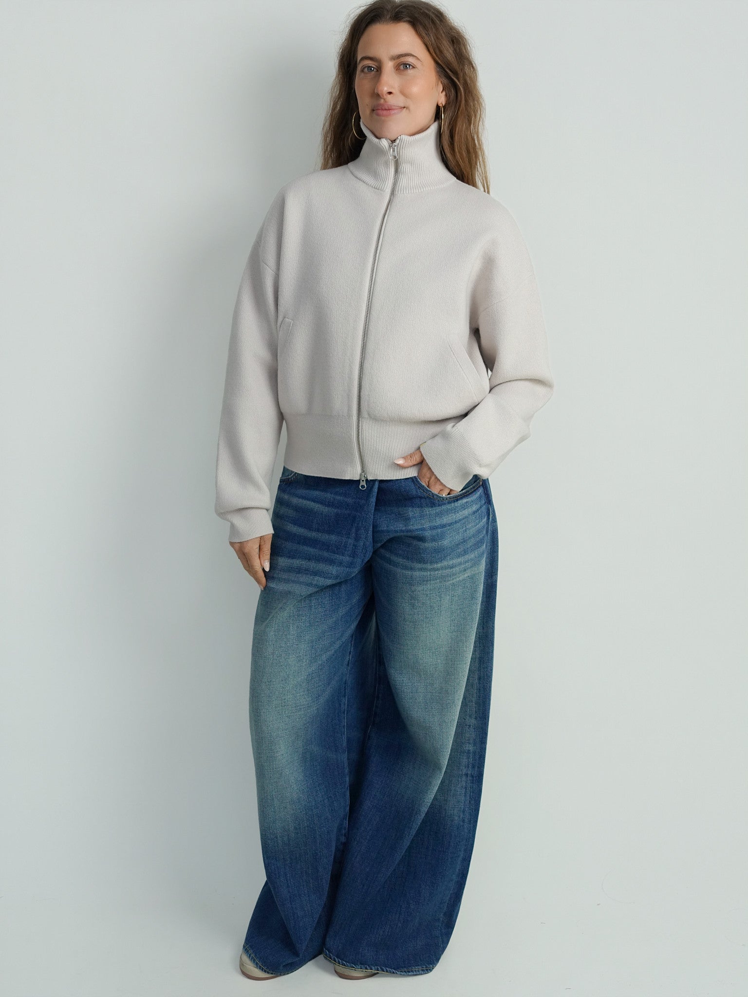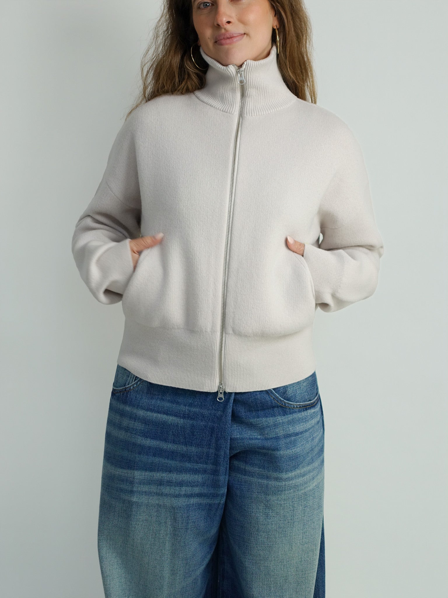 This chalk cardigan is crafted from a luxurious cashmere jacquard knit, creating a distinctive texture reminiscent of neoprene. The cropped bomber style creates a modern and playful look, while the two-way zip closure and practical side pockets add functionality. Lightweight and ideal for layering, this cardigan also doubles as a jacket during transitional seasons.