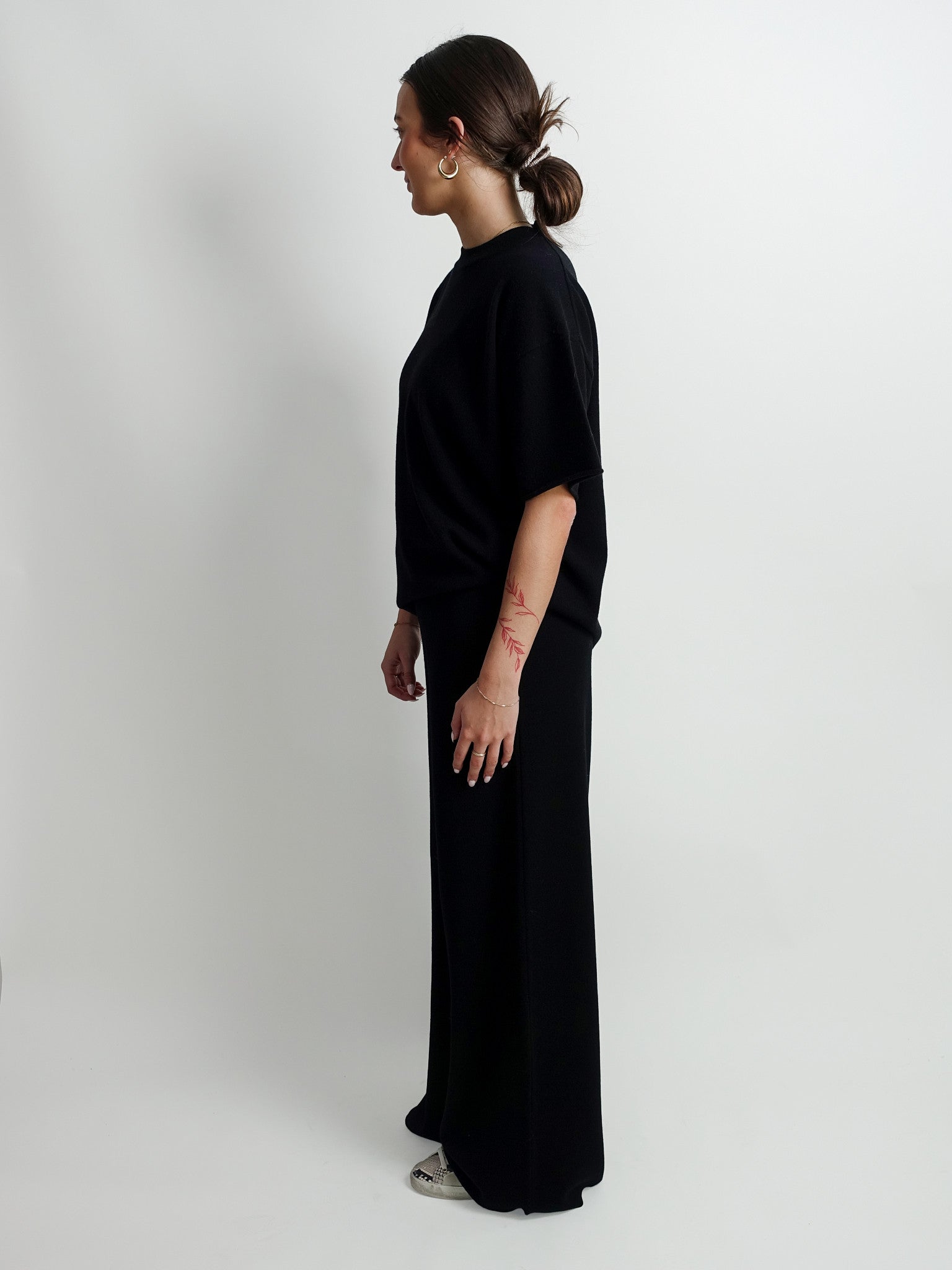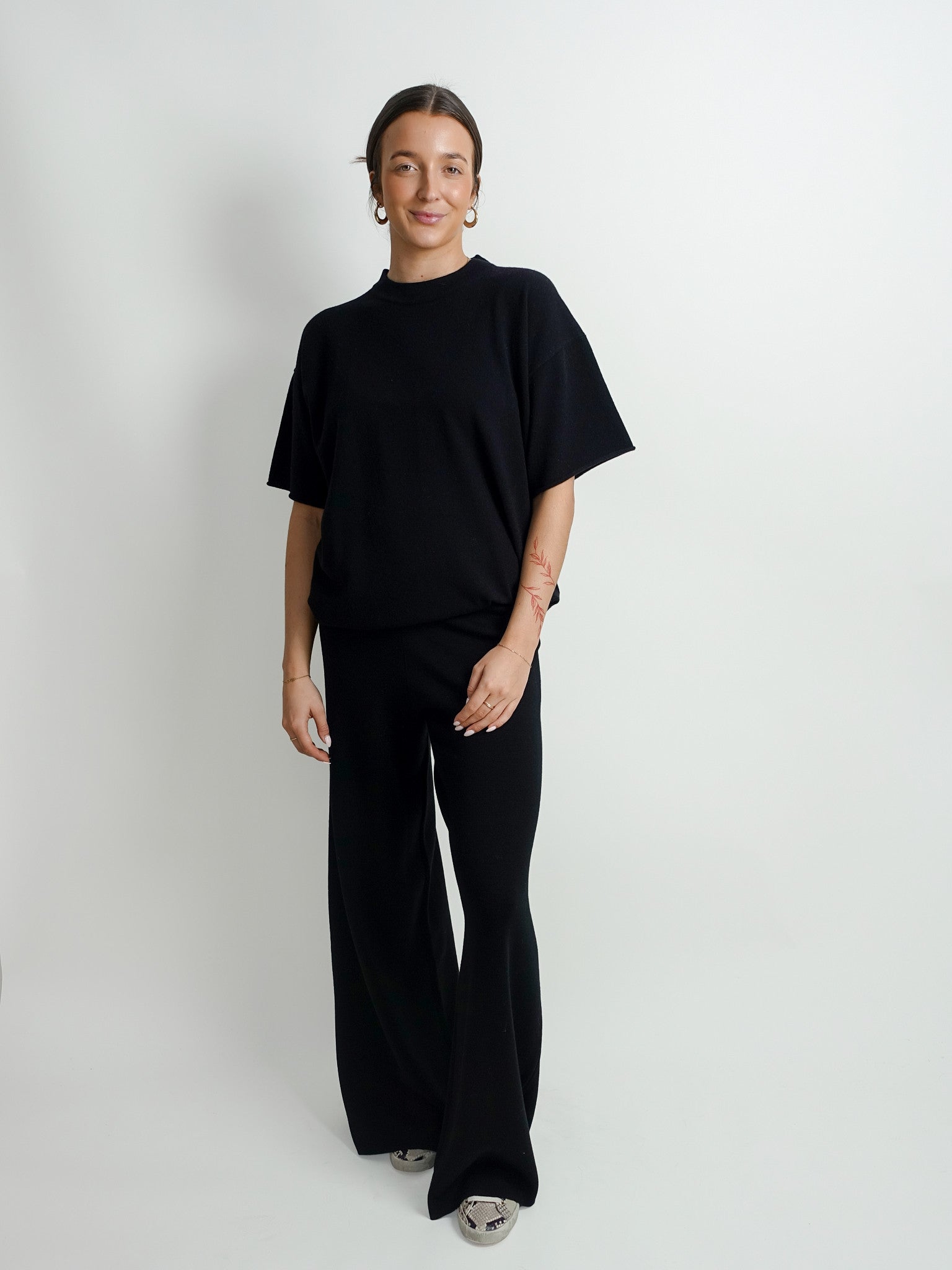 This black wool and cashmere T-shirt has a soft, refined look. The lightweight knit feels smooth and comfortable against the skin, offering subtle warmth. A calm, timeless piece that inspires confidence every day and effortlessly exudes quality.