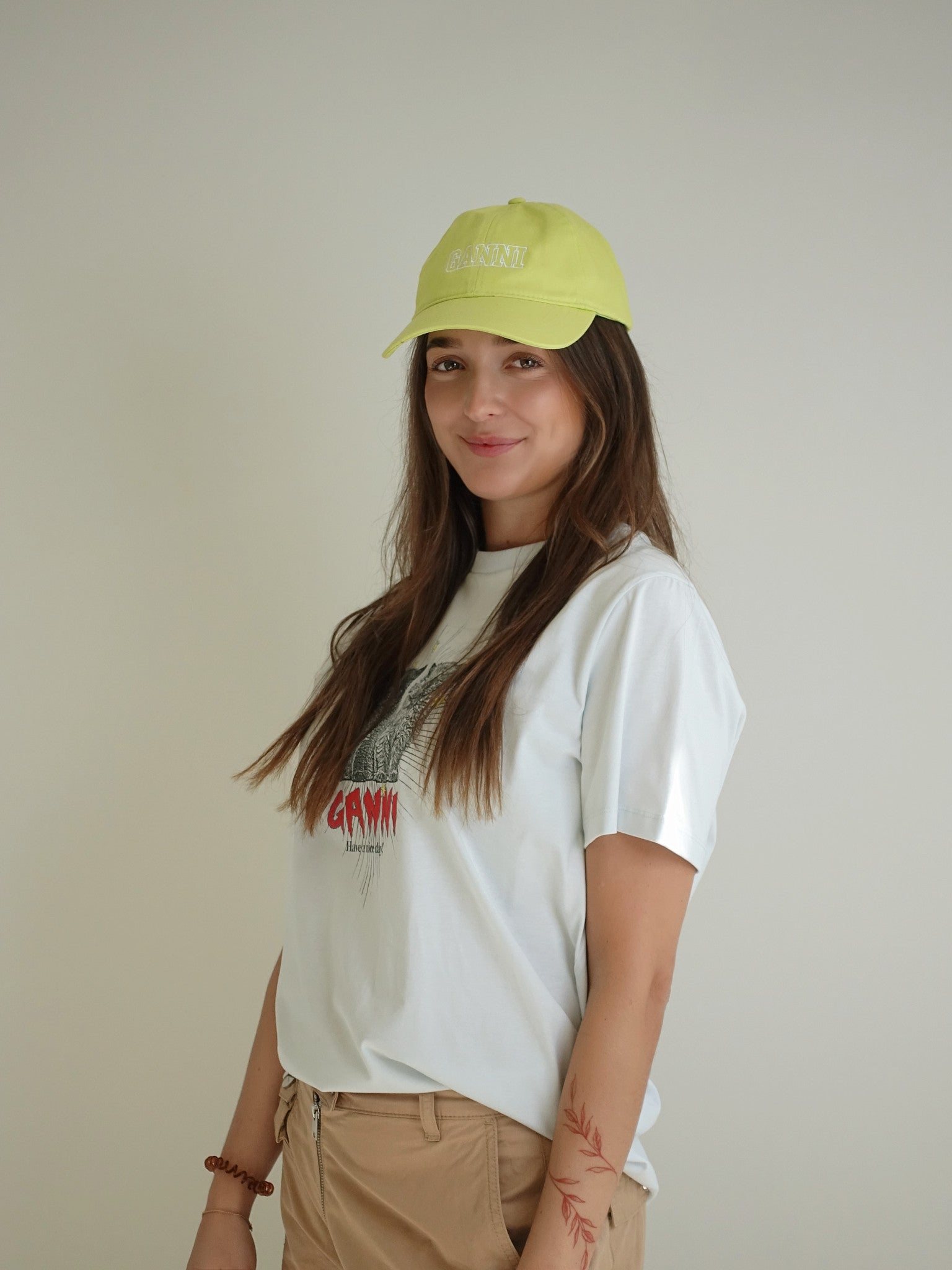Deze cap is gemaakt van 100% biologisch katoen en heeft een tijdloos design. Voorzien van een verstelbare klittenbandsluiting voor een perfecte pasvorm en een geborduurd GANNI logo op de voorkant.
