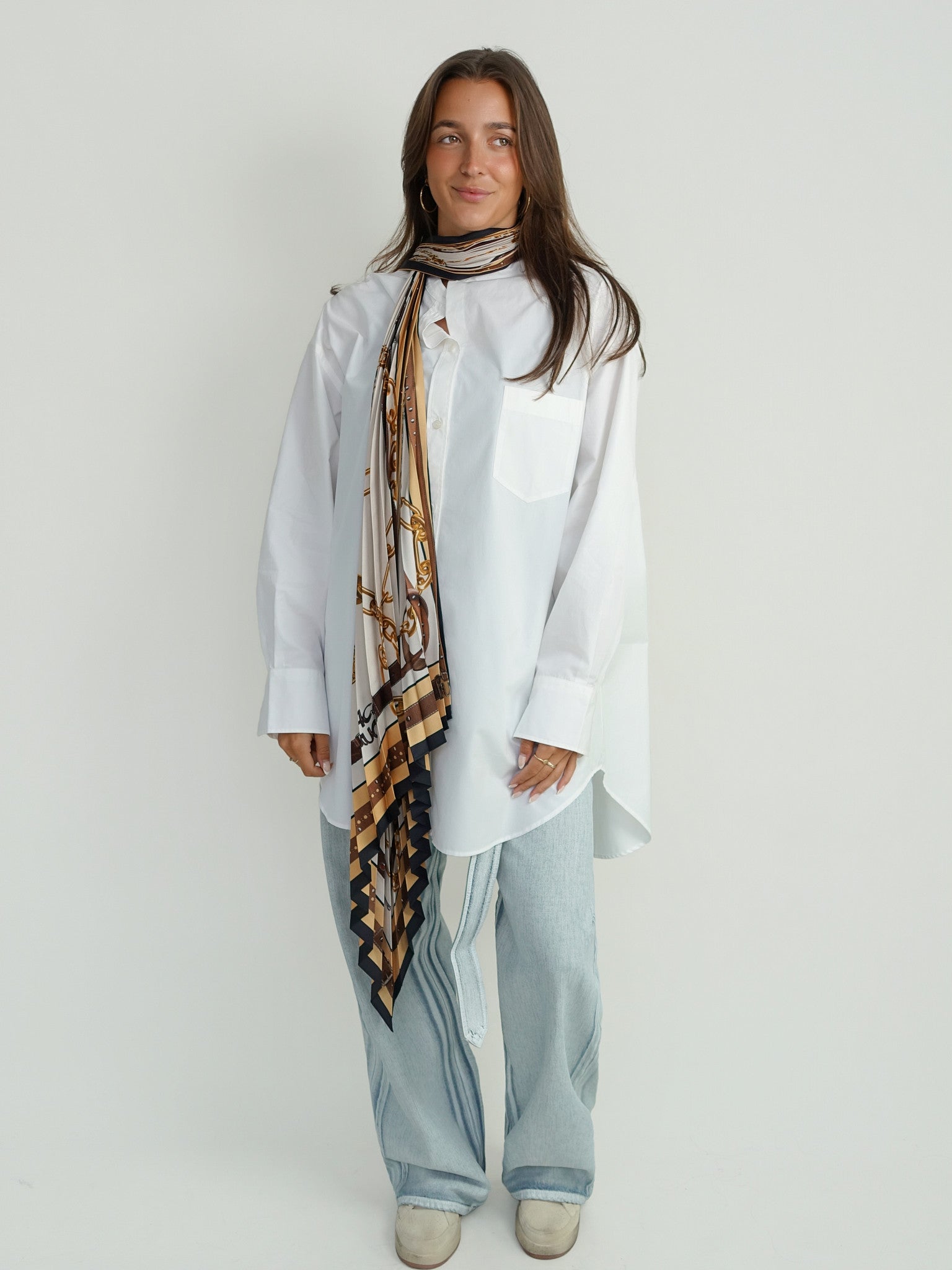 Een prachtige jurk met subtiele gouden accenten die een luxueus gevoel geven. Het silhouet valt soepel om het lichaam en is vervaardigd van een lichte stof die ideaal is voor warmere dagen. Het ontwerp ademt moderniteit en rust, perfect voor wie houdt van een ingetogen maar krachtige uitstraling.