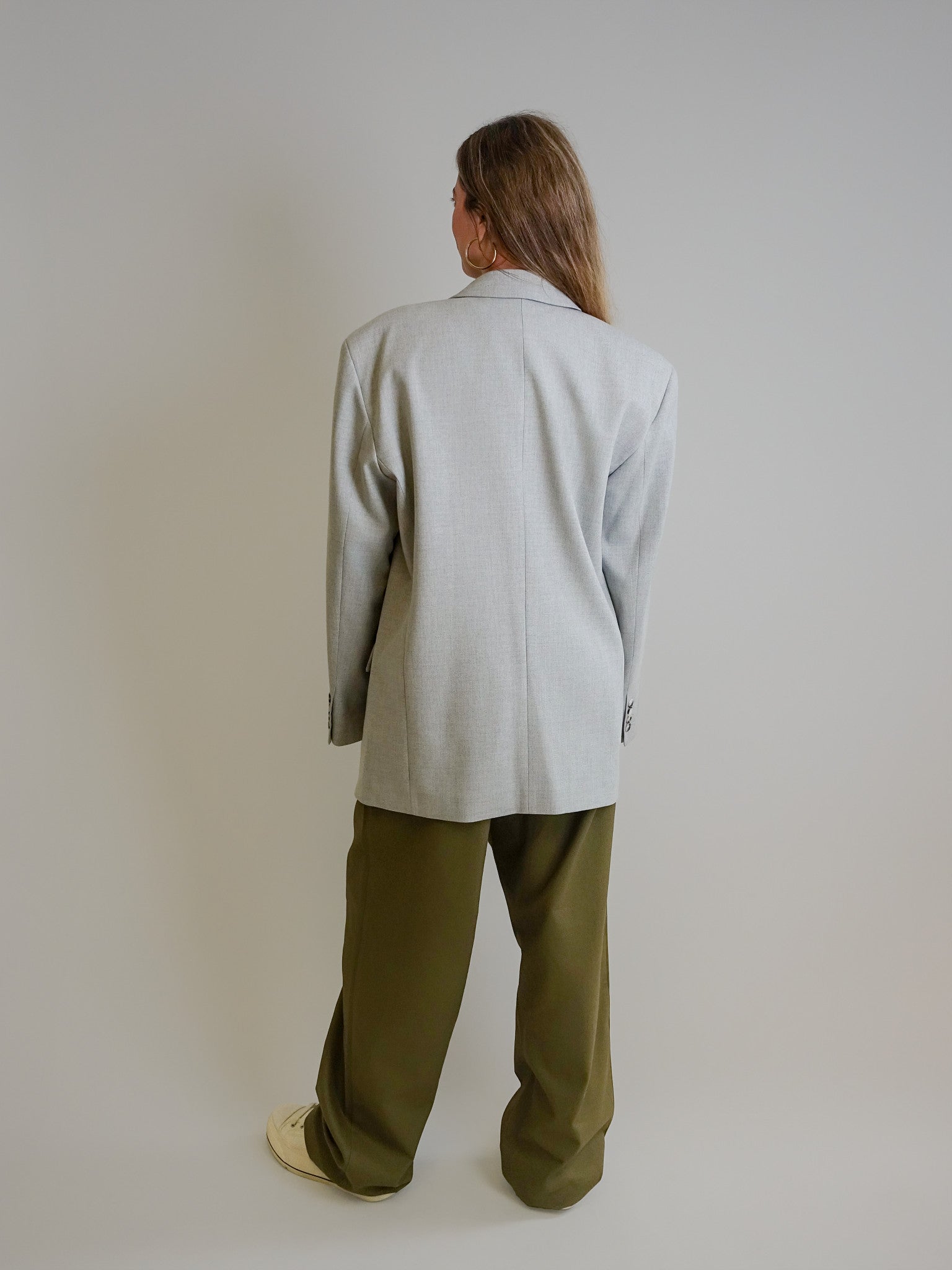 Deze grijze oversized blazer is een tijdloze essential voor elk seizoen. De lichte vulling in de schouders creëert een krachtig silhouet, terwijl de soepele viscosemix elegant meebeweegt. Een veelzijdig item dat moeiteloos klasse en moderne nonchalance combineert.