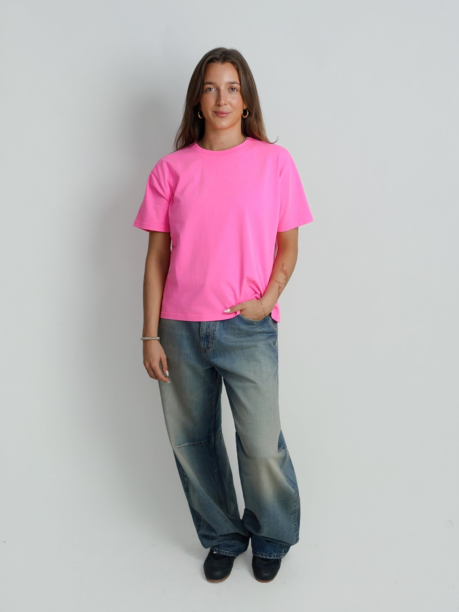 Dit tijdloze T-shirt in een krachtige fuchsia roze kleur is de ideale basis voor een energieke en moderne look. De verfijnde pasvorm en heldere tint maken het een veelzijdig item dat prachtig tot zijn recht komt onder een oversized vest of als opvallend solo-stuk op een denim. Een comfortabele essential die elke outfit direct een frisse impuls geeft.