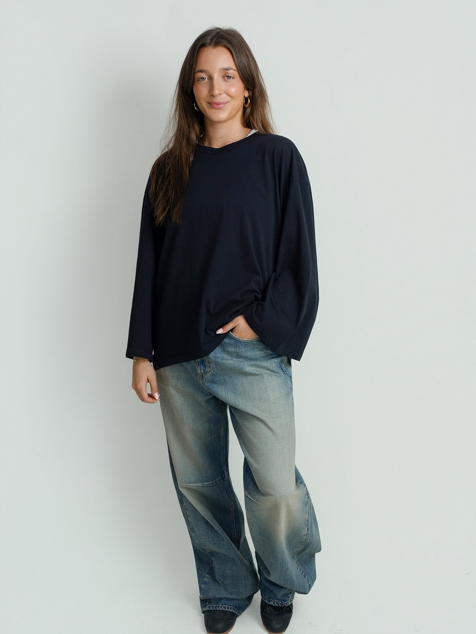Dit tijdloze T-shirt met lange mouwen in zwart is een energieke essential voor elke garderobe. De fijne stretchkwaliteit en de nauwsluitende pasvorm maken het een ideaal item om solo te dragen of als kleurrijk accent onder een oversized vest. Een moderne basic die moeiteloos comfort combineert met een krachtig statement.