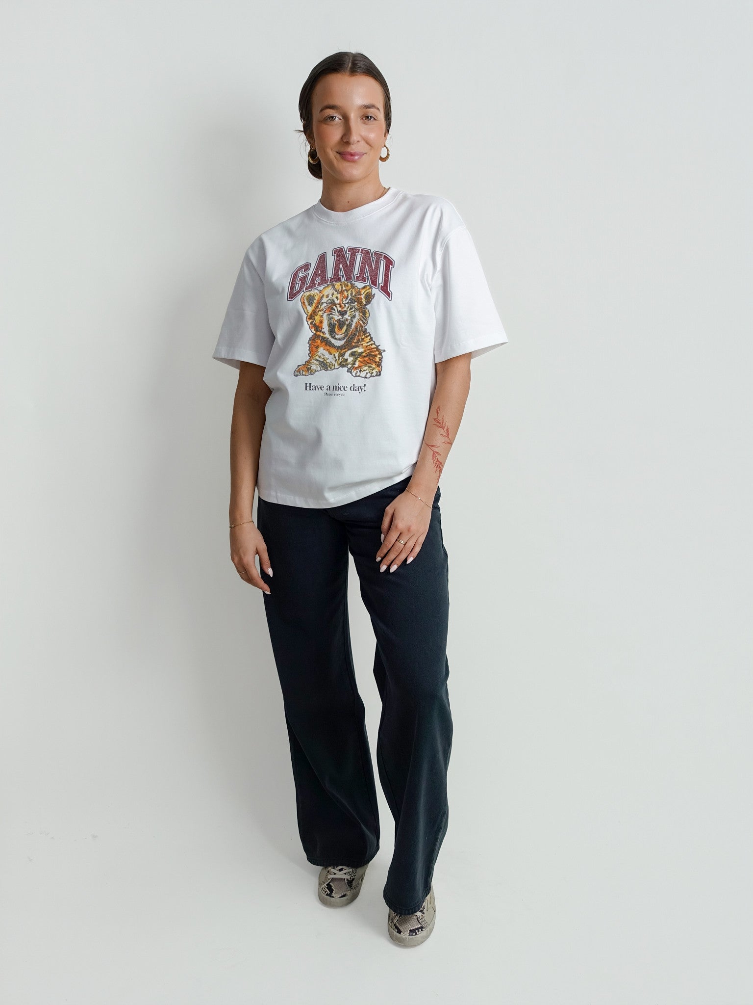 Dit ontwerp in een helderwitte tint combineert een klassieke ronde halslijn met een grafisch, speels karakter door de opvallende tijgerprint. Het hoogwaardige materiaal biedt een zachte touch en een ontspannen, rechte pasvorm die zorgt voor dagelijks draagcomfort. Een eigentijds basisstuk dat moeiteloos een sportieve energie en minimalistische stijl verenigt.