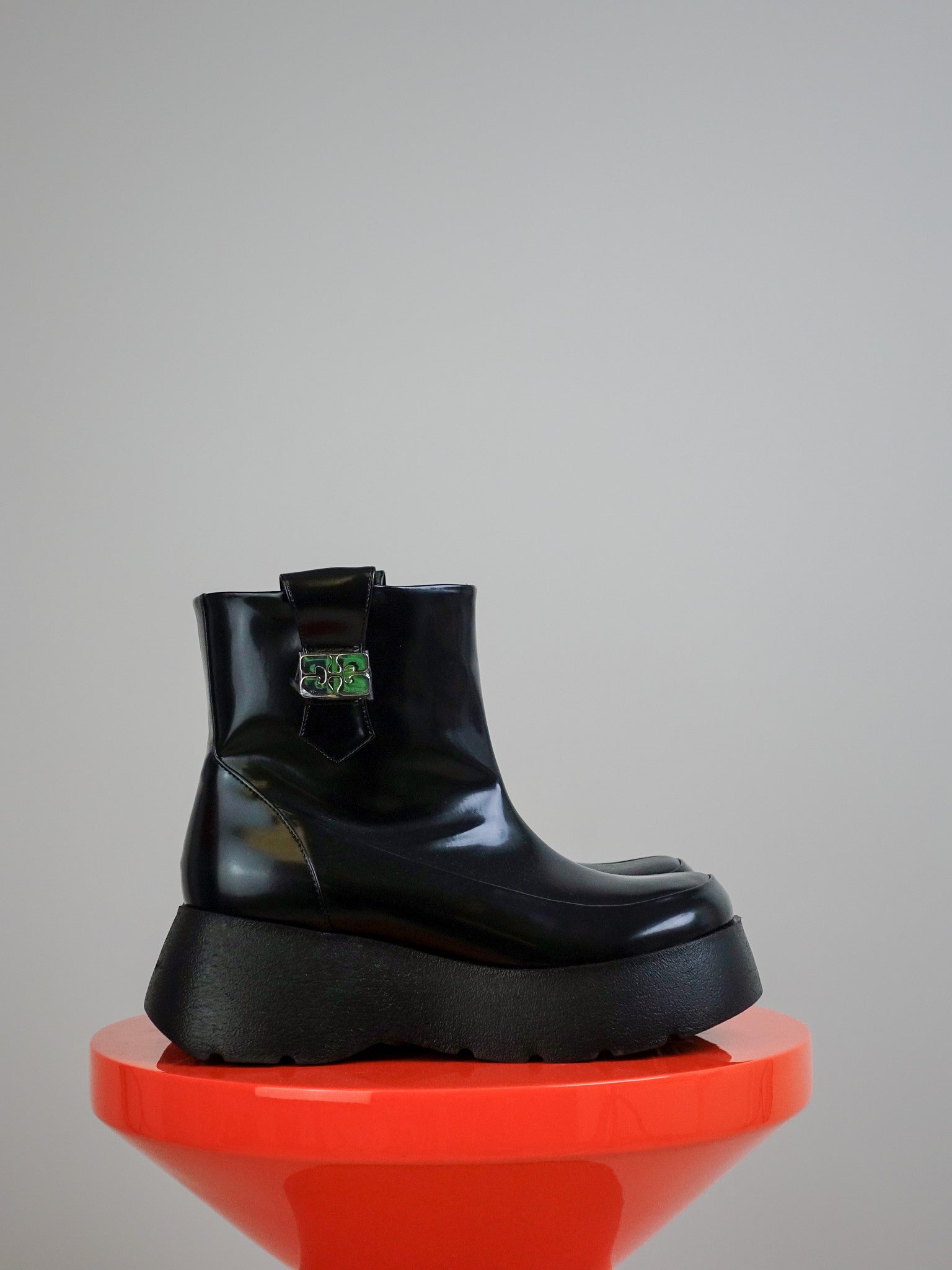 Chunky laars in glanzend zwart met grove zool en subtiel embleemdetail. Het silhouet is krachtig en eigentijds, ideaal om elke look een zelfverzekerde twist te geven. De hoge schacht en stevige constructie zorgen voor comfort, warmte en een moderne attitude bij elk seizoen.