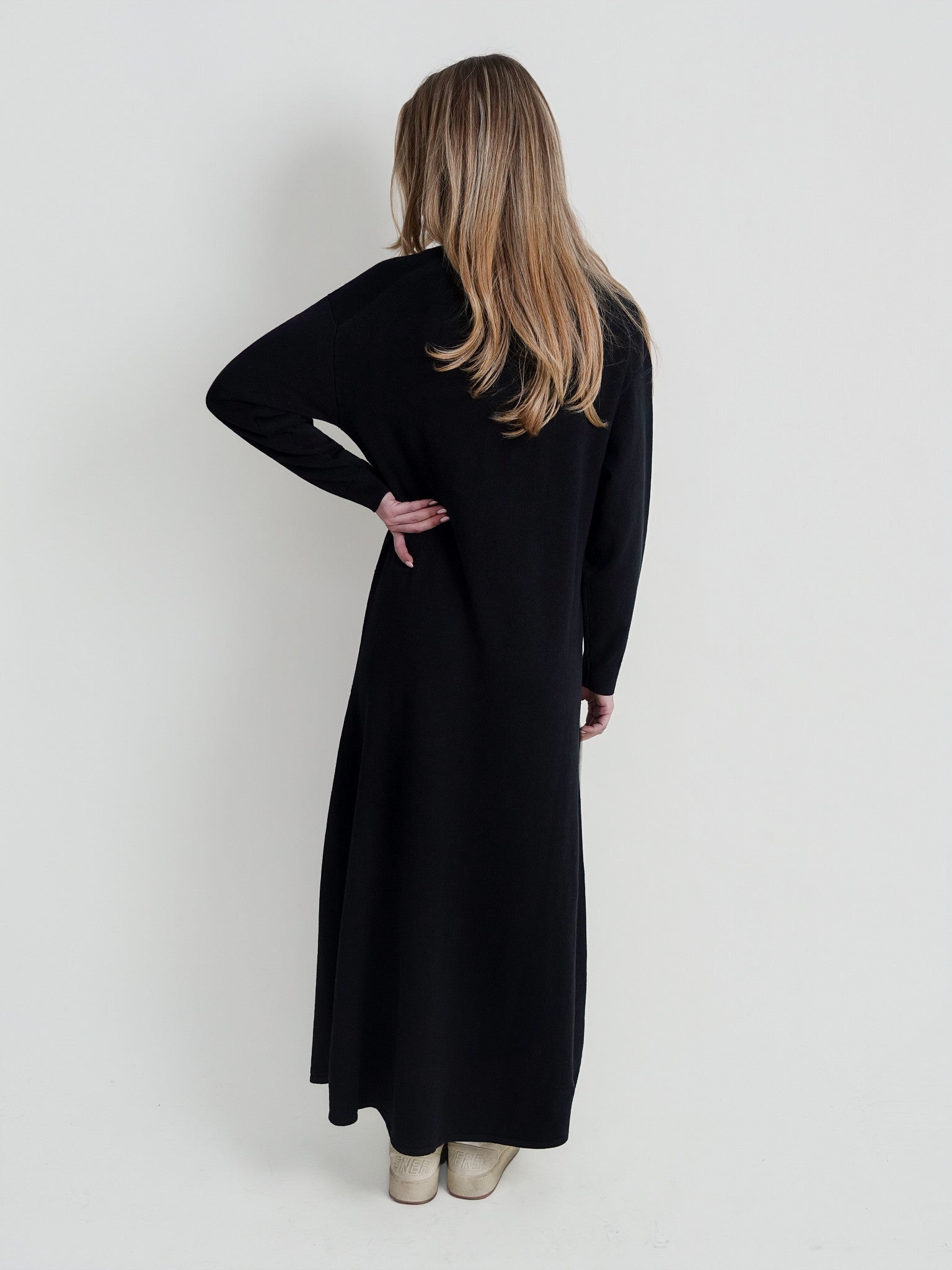 Dit zwarte ontwerp combineert het comfort van een trui met de elegantie van een jurk in een krachtig, oversized silhouet. De hoogwaardige stof valt soepel en zwaar, wat zorgt voor een moderne uitstraling en tijdloze eenvoud. Een minimalistisch item dat luxe en nonchalance moeiteloos verenigt.