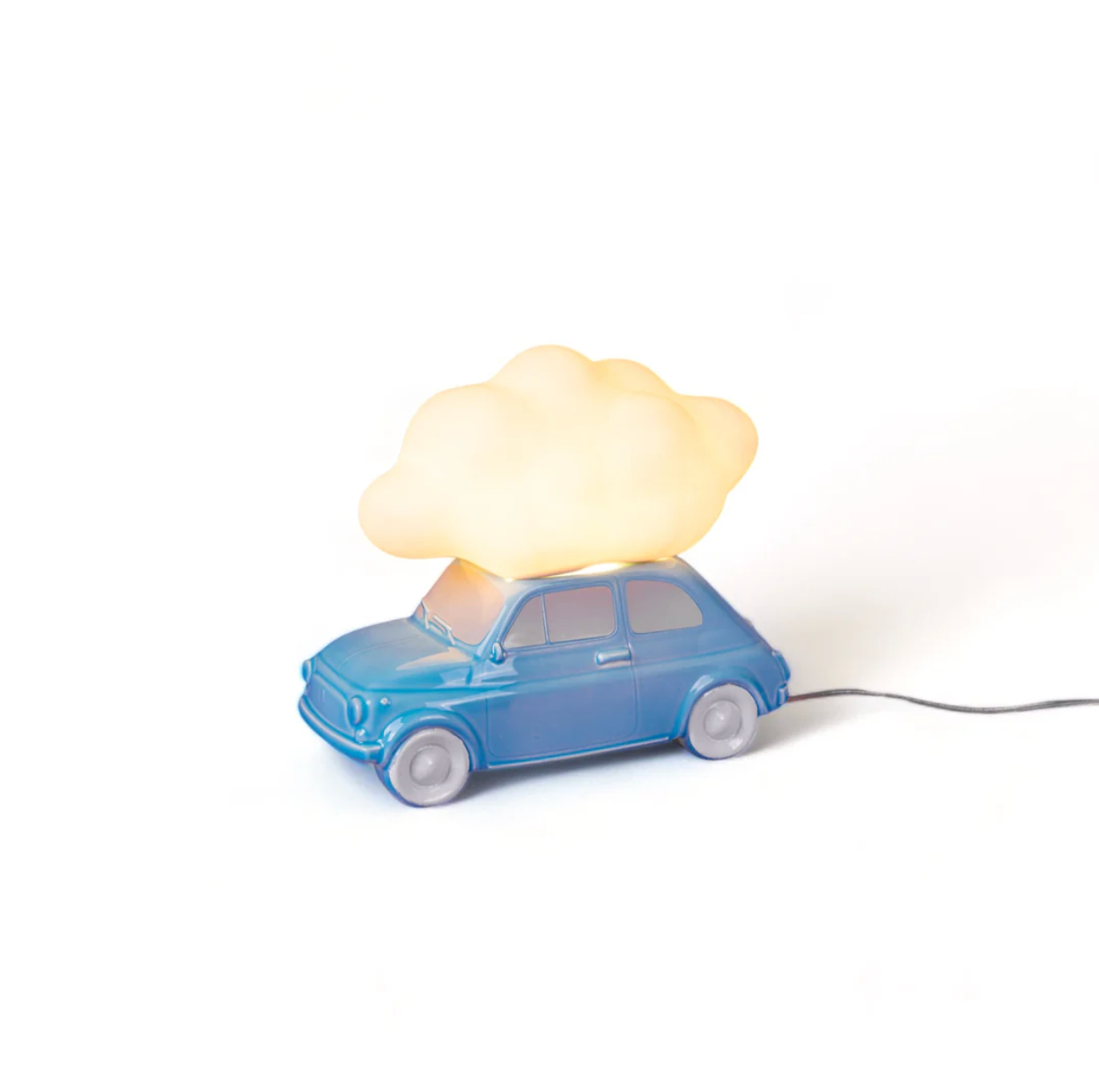 Blauwe tafellamp in de vorm van een klassieke Fiat 500, met een zachte oplichtende wolk als lampenkap. De speelse combinatie van nostalgie en fantasie maakt dit een vrolijk designobject voor elk interieur. Perfect als nachtlamp of eyecatcher in een kinderkamer.