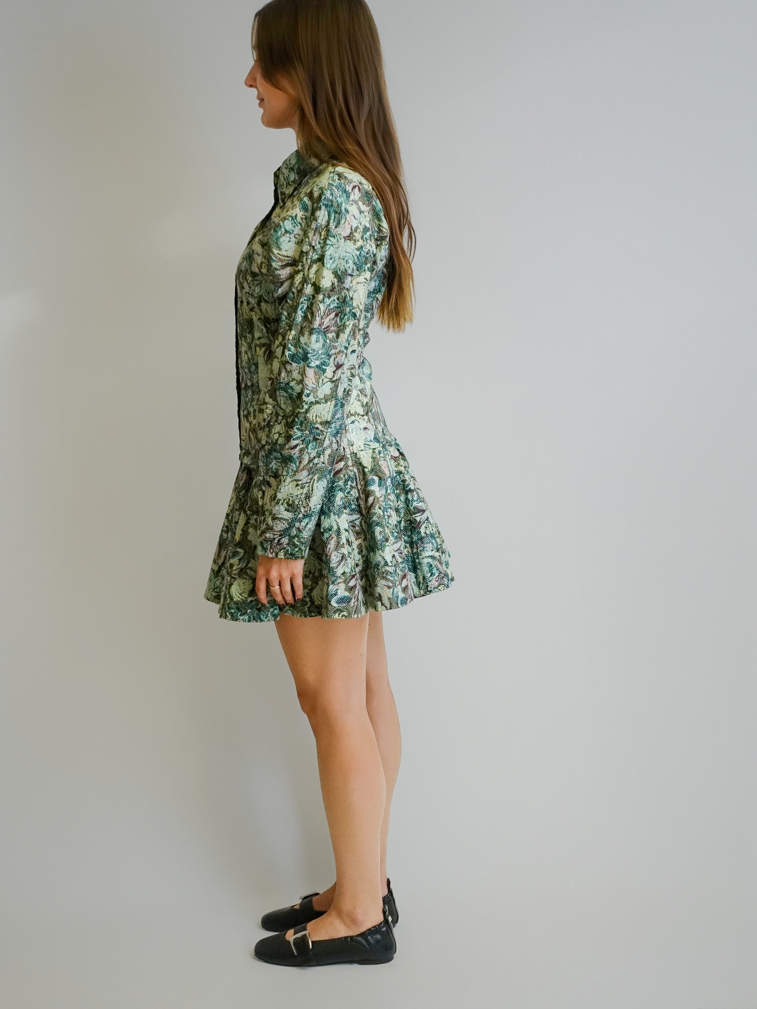 Deze mini-jurk in jadeite is gemaakt van stretchkatoen en valt op door de elegante tapisserie-bloemenprint. Het ontwerp heeft een klassieke kraag en een knoopsluiting aan de voorkant die zorgen voor een tijdloze uitstraling. De verlaagde taille en de speelse ruches aan de zoom geven de jurk een vrouwelijke en luchtige touch. Een veelzijdig kledingstuk dat moeiteloos gedragen kan worden voor zowel casual als meer geklede gelegenheden.