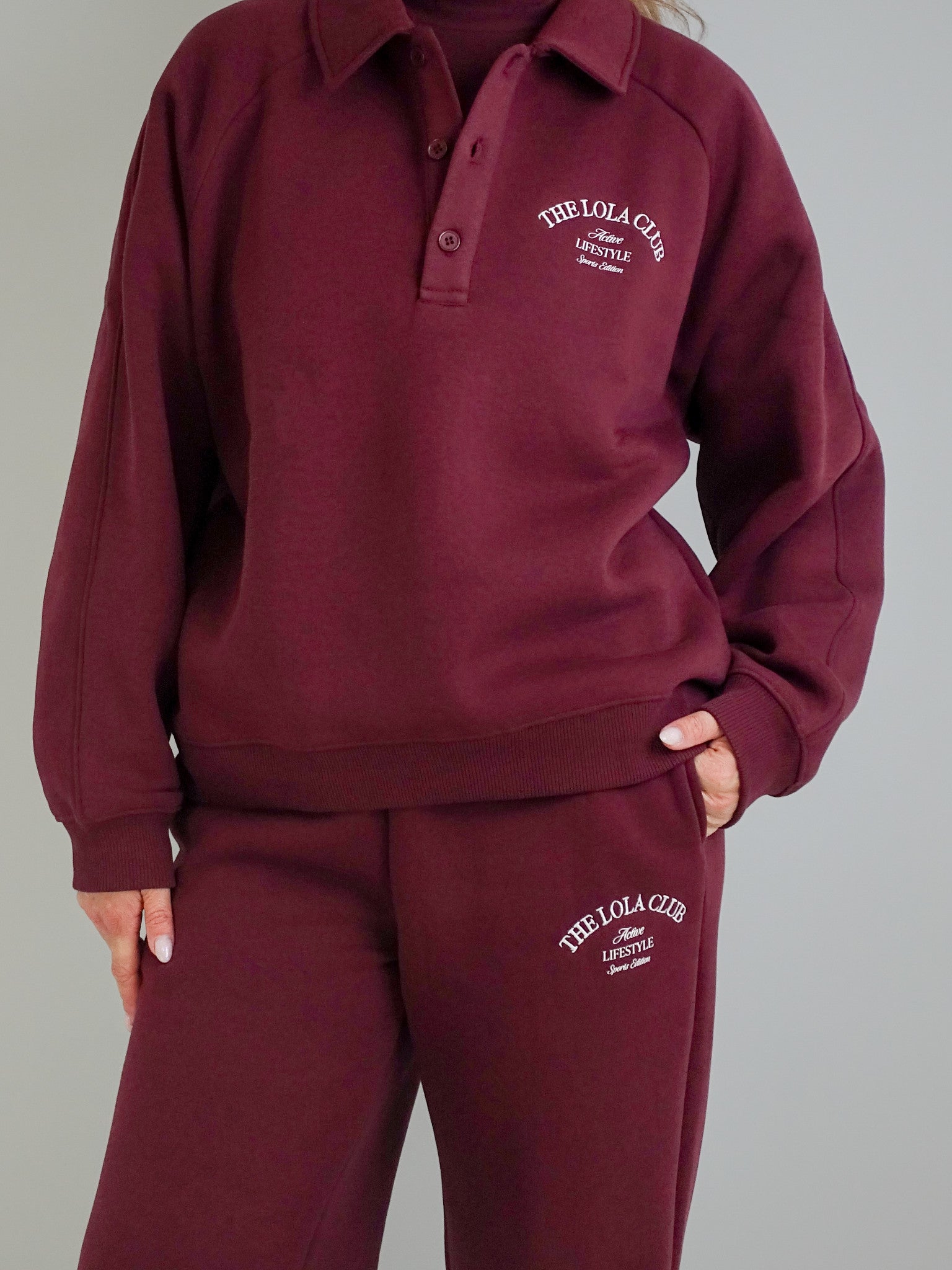 Gebreide polo sweater in kersenrood met een klassieke kraag en diepe V-hals. De zachte stof en rechte pasvorm zorgen voor comfort zonder in te leveren op stijl. Een tijdloos item met een sportieve, vrouwelijke uitstraling.