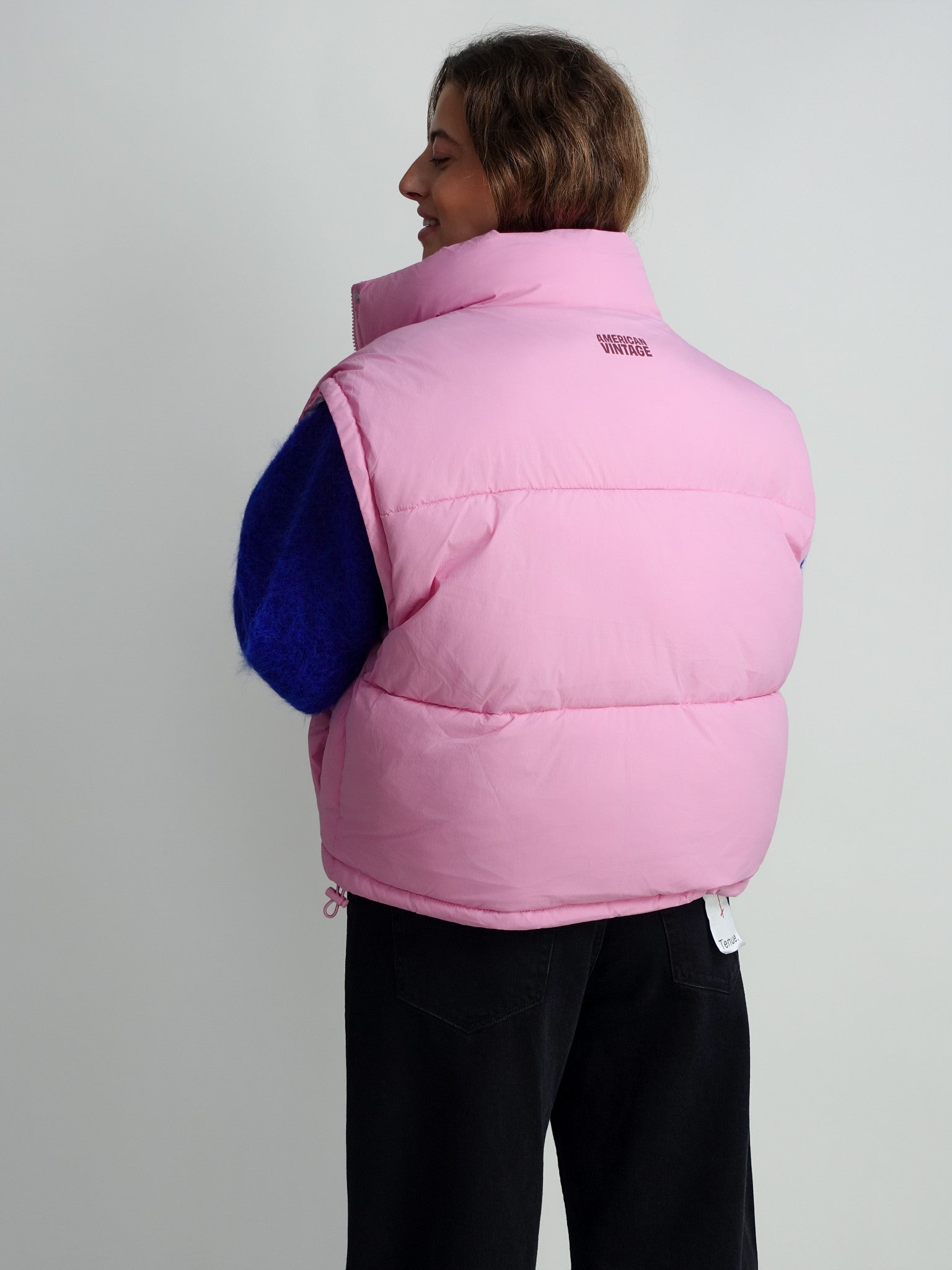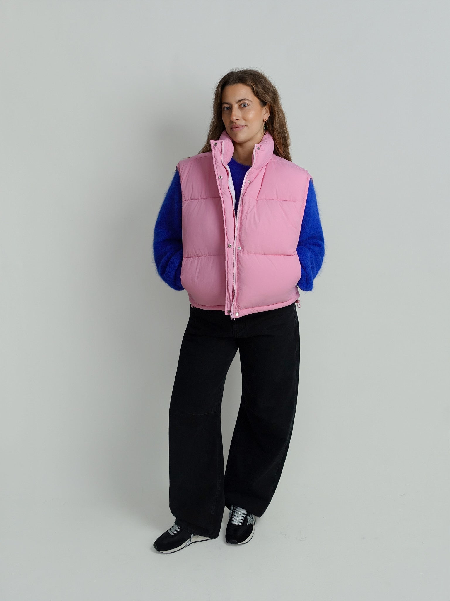 Dit puffer vest in zacht poederroze biedt de perfecte balans tussen functionaliteit en on-trend esthetiek. De volumineuze gewatteerde structuur en hoge kraag creëren een krachtig silhouet dat moeiteloos warmte toevoegt. Een ideale gelaagde essential om je favoriete knitwear een eigentijdse, sportieve upgrade te geven.