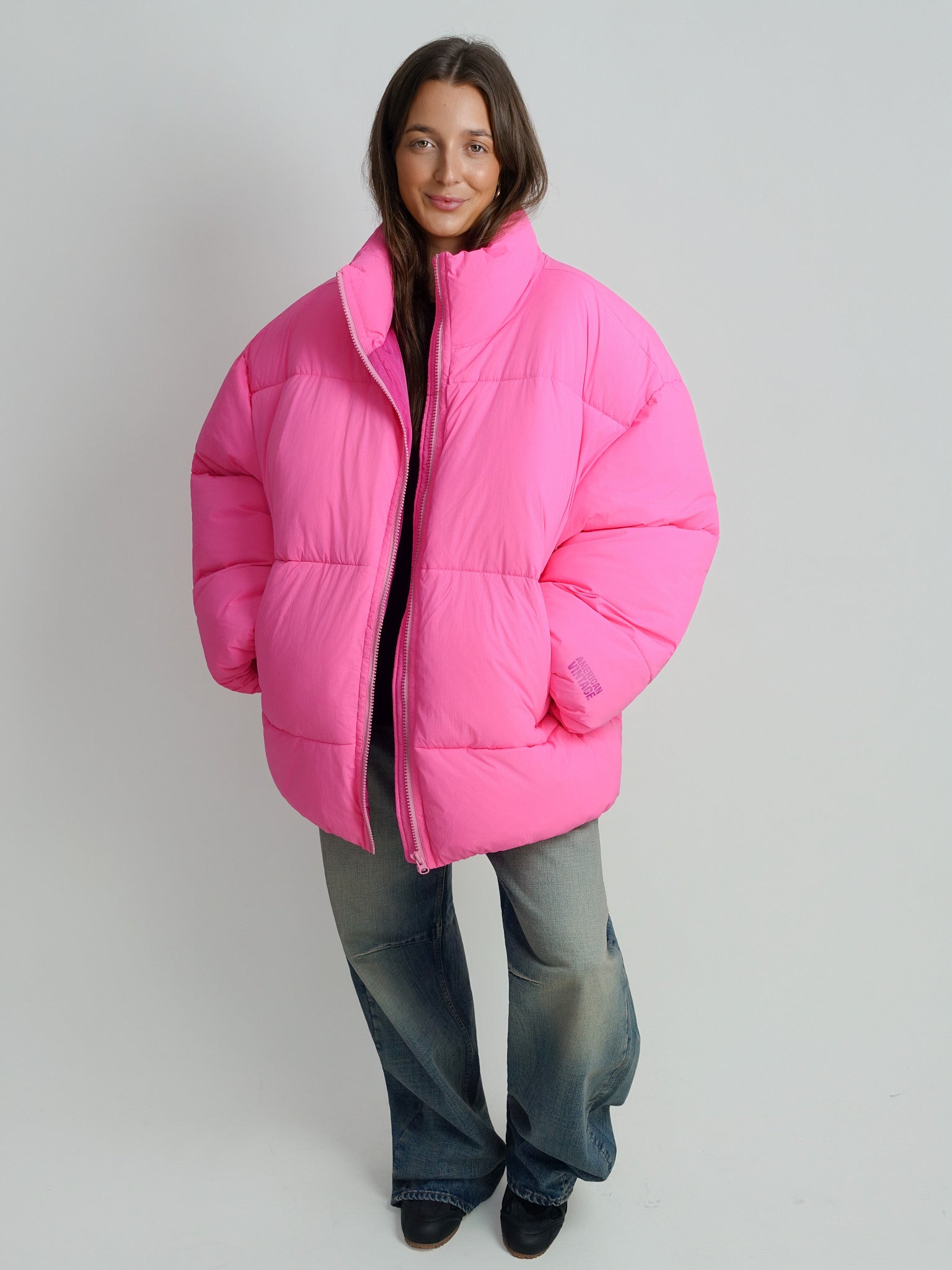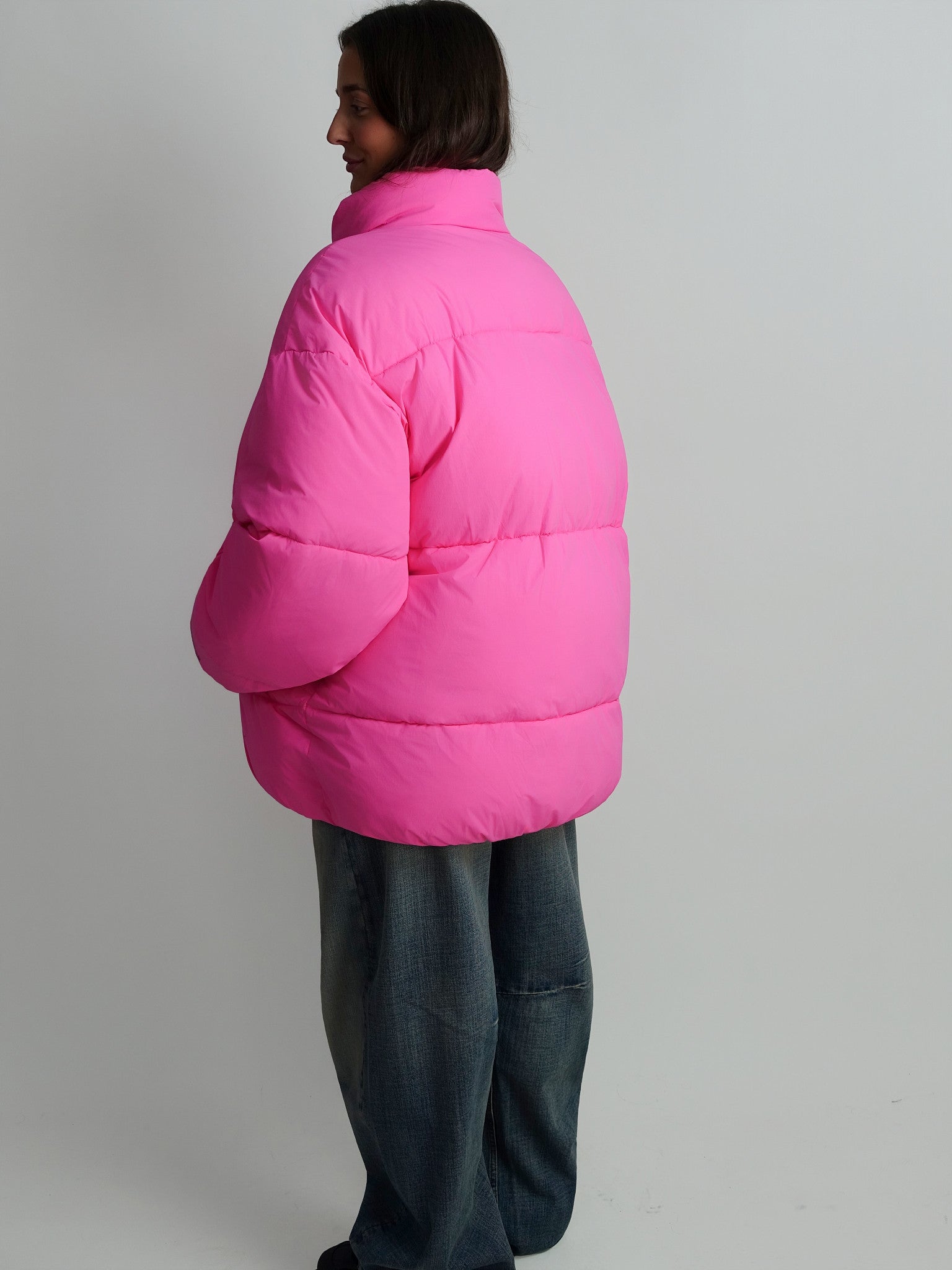 Deze gewatteerde jas in felroze is een onmisbaar statement piece dat functionaliteit met een high-fashion esthetiek combineert. Het volumineuze, oversized silhouet en de hoge kraag bieden ultieme warmte en een krachtige uitstraling. Een modern item dat je winterse look direct een gedurfde en energieke impuls geeft.