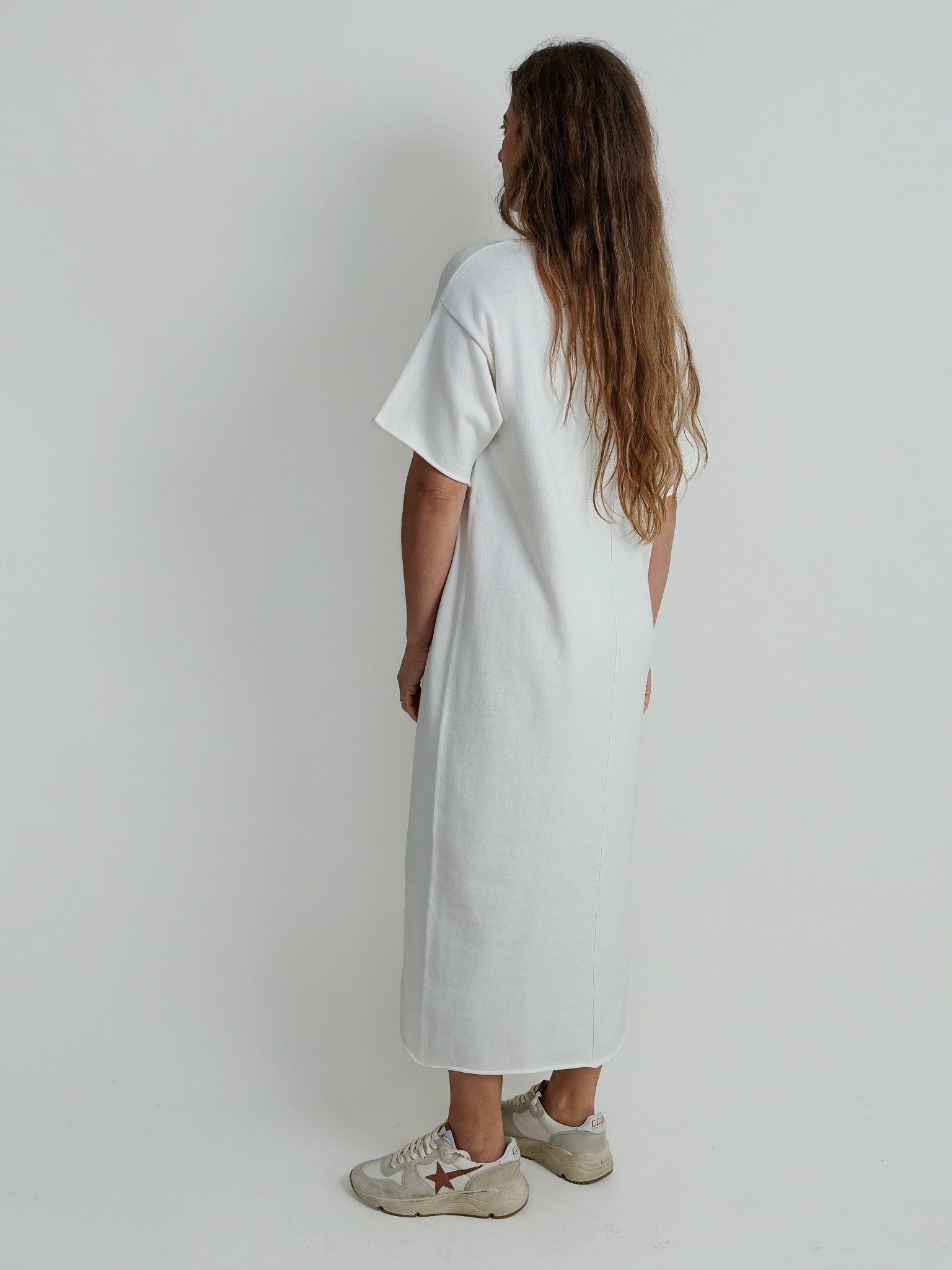 Deze jurk in een zachte off-white tint straalt rust en elegantie uit. Het materiaal van katoen en kasjmier biedt een verfijnd draagcomfort en een natuurlijke valling die de vrouwelijke vormen subtiel accentueert.