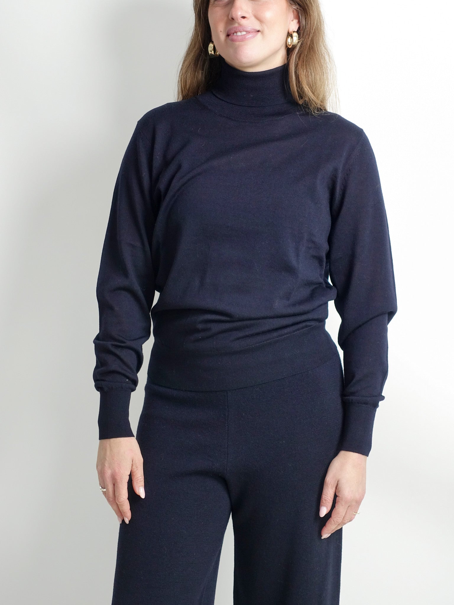 Coltrui van merinowol in diep navy met een zachte, verfijnde uitstraling. Het fijne breisel voelt licht en comfortabel aan op de huid en biedt aangename warmte. Een tijdloos silhouet dat rust en kwaliteit uitstraalt en geschikt is voor dagelijks draagplezier.