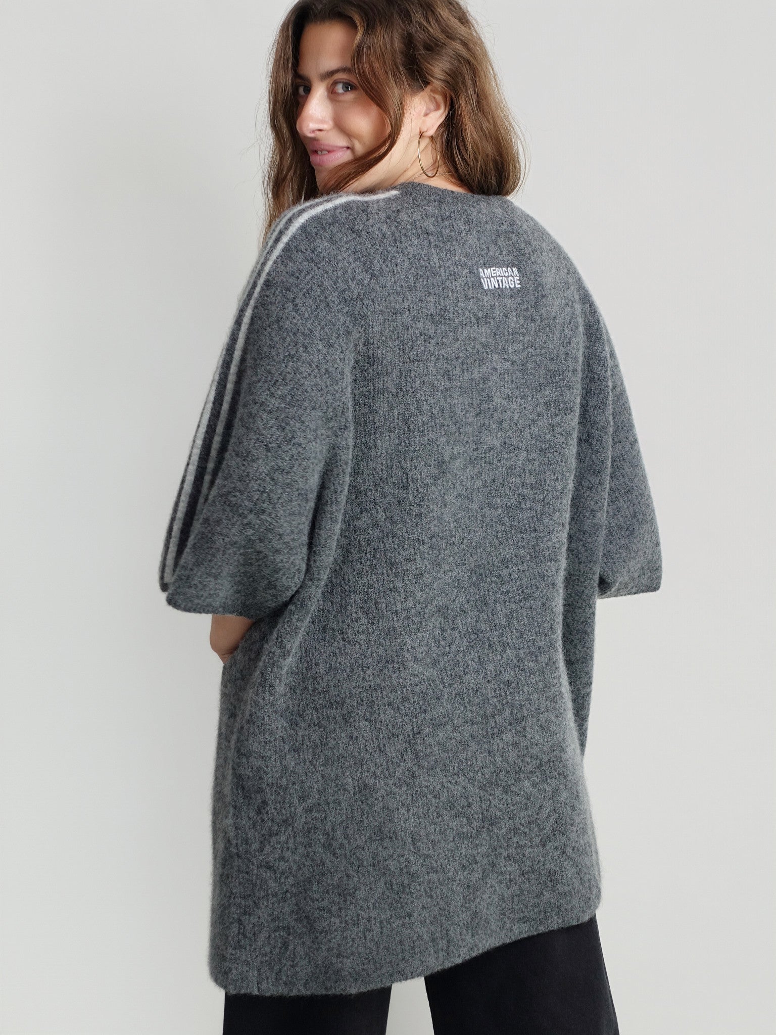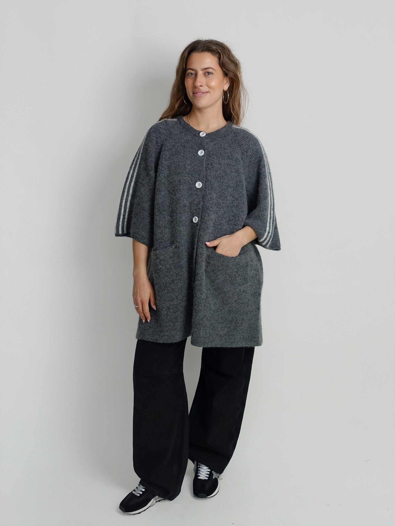 Dit halflange vest in gemêleerd antracietgrijs is een meesterwerk van textuur en modern design. De halflange mouwen met sportieve contraststrepen en de zachte, harige wolmix geven een eigentijdse draai aan een klassieker. Perfect als stijlvolle buitenlaag of als gelaagde eyecatcher tijdens frissere dagen.